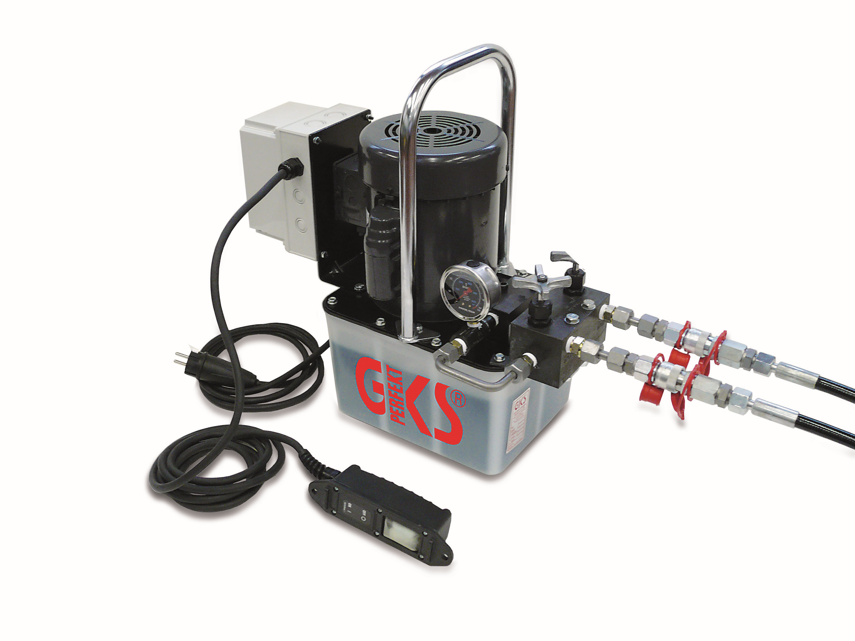 Pompy hydrauliczne PE o napędzie elektrycznym przeznaczone są do współpracy z podnośnikami hydraulicznymi GKS-PERFEKT. Stosowanie pompy hydraulicznej gwarantuje równomierne podnoszenie oraz opuszczanie ciężaru. W przypadku ograniczonej przestrzeni manewrowej podczas załadunku towaru używanie pompy zewnętrznej pozwala na bezpieczne użycie podnośników.