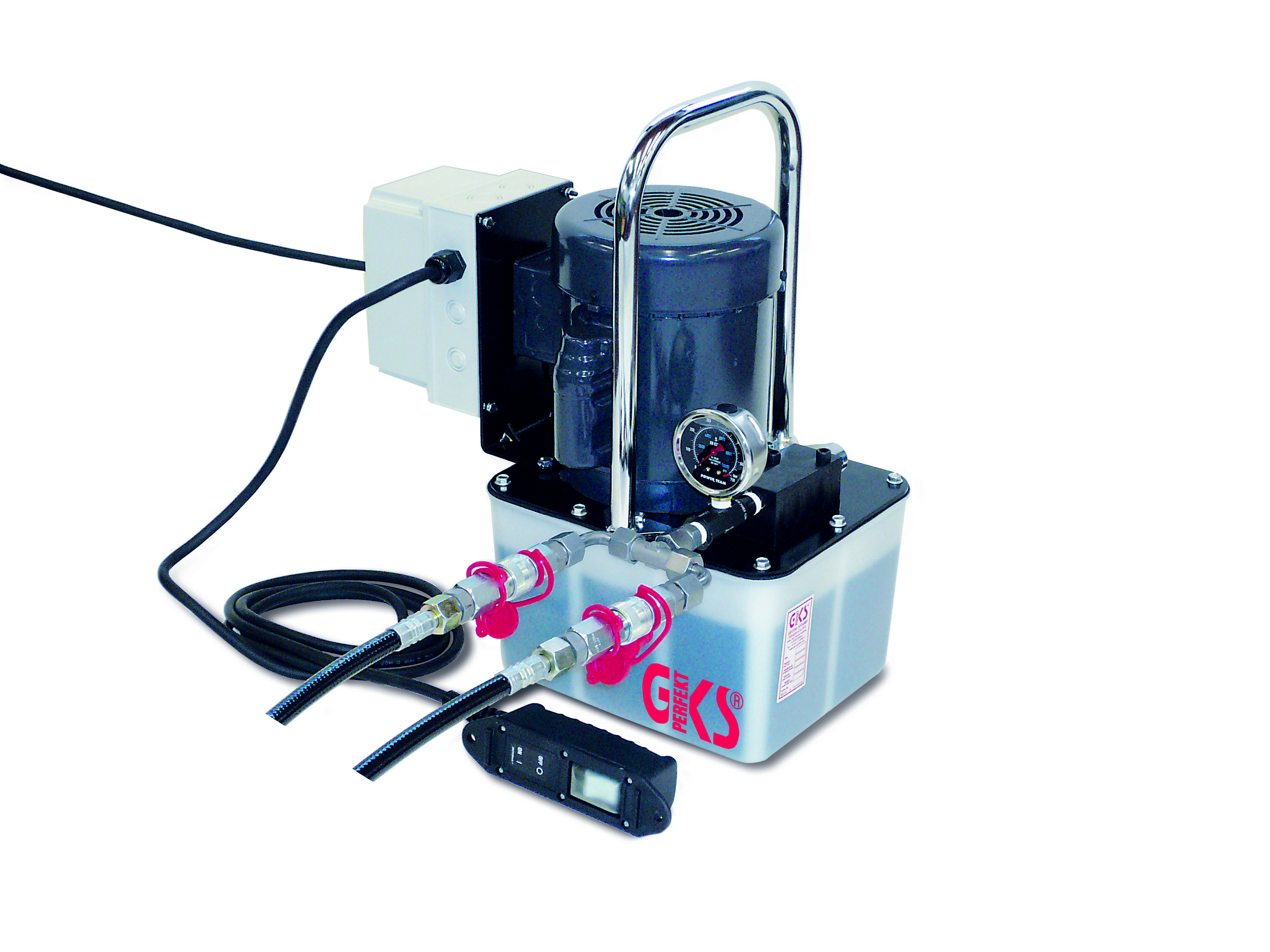- Modelo estándar con mando a distancia incluido, manómetro, válvula distribuidora de 2/2 vías para cilindros de efecto sencillo y 2 mangueras de 3 m con cierres rápidos antigoteo en cada lado