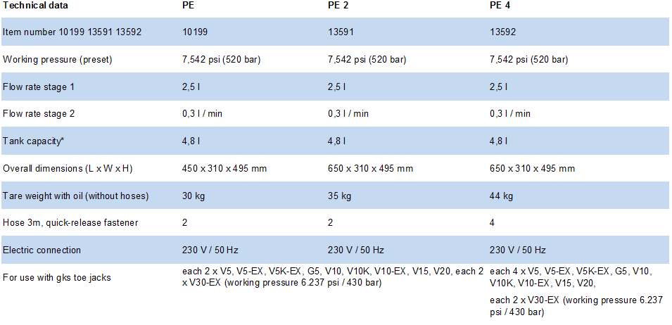 The option „Bigger Oil Reservoir“ is mandatory to operate 4 GKS toe jacks V30-EX, working pressure setting 6,237 psi / 430 bar.