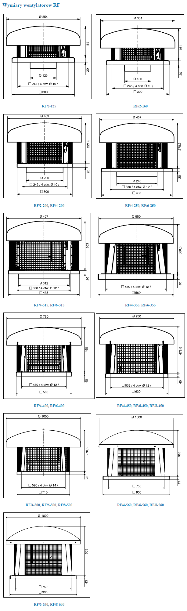 Wentylatory dachowe wyciągowe RF przeznaczone są do wentylacji pomieszczeń o niskim stopniu zanieczyszczenia powietrza. Stosowane są w instalacjach wyciągowych z mieszkań, supermarketów, hal przemysłowych, warsztatów, magazynów, toalet, garaży, parkingów, budynków gospodarczych.