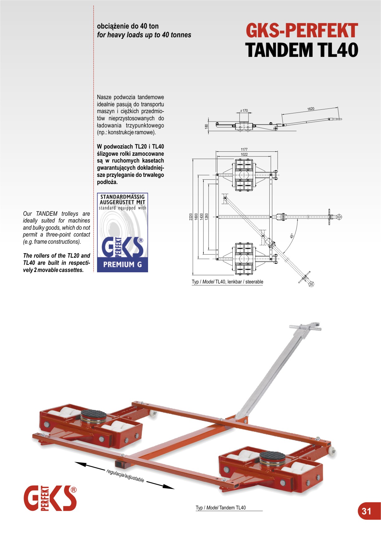 - Na zamówienie do transportu po "trudnym" podłożu dostępne stalowe rolki.