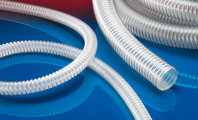 Wąż wyciągowo-przesyłowy dla przemysłu spożywczego i farmaceutycznego (FDA); PUR + stal szlachetna, ciężki, wewnątrz gładki.